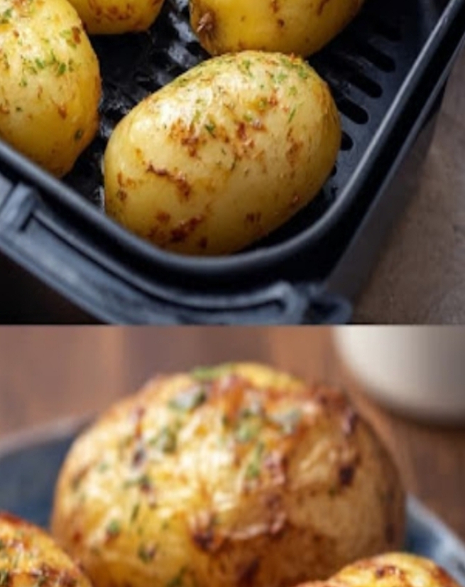 Ingredients (and Why They Matter)4 medium russet potatoes – Russets are the best choice because their thick skin crisps up beautifully while their starchy interior turns fluffy and light.1–2 tablespoons olive oil – Helps the skins crisp up and adds a subtle, savory flavor.1 teaspoon kosher salt – Enhances the natural taste of the potatoes and ensures each bite is flavorful.½ teaspoon black pepper – Adds a touch of warmth and depth.Optional toppings: sour cream, shredded cheese, chives, butter, bacon bits, salsa, or chili.—Step-by-Step InstructionsStep 1: Prep the PotatoesWash and scrub the potatoes thoroughly to remove any dirt. Pat them completely dry with a towel — moisture will prevent crisping.Step 2: Season the SkinsRub each potato with olive oil, making sure every inch is coated. Sprinkle generously with kosher salt and a touch of black pepper. This simple step ensures a crispy, flavorful skin.Step 3: Air Fry to PerfectionPreheat your air fryer to 400°F (200°C). Place the potatoes in the basket, leaving space between them for air circulation. Cook for 35–40 minutes, flipping halfway through, until the skins are crisp and a fork easily pierces the center.Step 4: Serve and EnjoySlice open the potatoes, fluff the insides with a fork, and load them with your favorite toppings.—Why This Recipe is LovedFaster than the oven – Ready in under 40 minutes.Healthier than frying – Crispy without the excess oil.Customizable – Works as a simple side or a loaded main dish.Effortless – Just a handful of ingredients and minimal prep.Pro Tips for the Perfect Air Fryer Baked PotatoPierce the potatoes with a fork before cooking to release steam and prevent splitting.Don’t overcrowd the air fryer basket — this ensures even cooking.For extra crispy skins, brush with an additional light layer of oil halfway through.If your potatoes are larger, extend the cooking time by 5–10 minutes.Serving SuggestionsAir fryer baked potatoes are incredibly versatile. Pair them with:Grilled steak or chicken for a hearty dinner.Fresh garden salad for a lighter balance.Chili or pulled pork to transform them into a complete, filling meal.Simple butter and chives for a classic, timeless side dish.ConclusionThese air fryer baked potatoes prove that comfort food doesn’t have to be complicated. With their golden, crispy skins and irresistibly fluffy centers, they’re the perfect canvas for any topping you crave. Whether you’re serving them as a quick weeknight side, a meal-prep staple, or a fully loaded main dish, this recipe guarantees delicious results every single time.