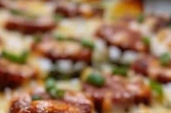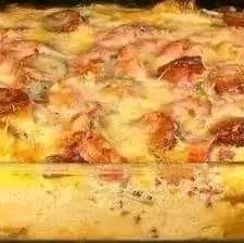 Pour 3/4 cup of cheese sauce onto the bottom of a baking dish that is 9×9 inches in diameter. Top 1/3 of the lasagna noodles with sauce, then top with 1/2 of the cooked chicken and 1/2 of the ham. Dollop 1 cup of sauce over the ham and chicken. Start with half of the remaining lasagna noodles, then add half of the remaining chicken, half of the remaining ham, and one more cup of cheese sauce. Repeat layering as needed. Lastly, add the remaining lasagna noodles, sauce, half a cup of Swiss cheese, bread crumbs, and Italian spice over the top. Place aluminum foil over the dish.
