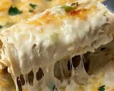 Pour the white sauce evenly over the rolled enchiladas in the baking dish. Sprinkle additional shredded cheese on top.