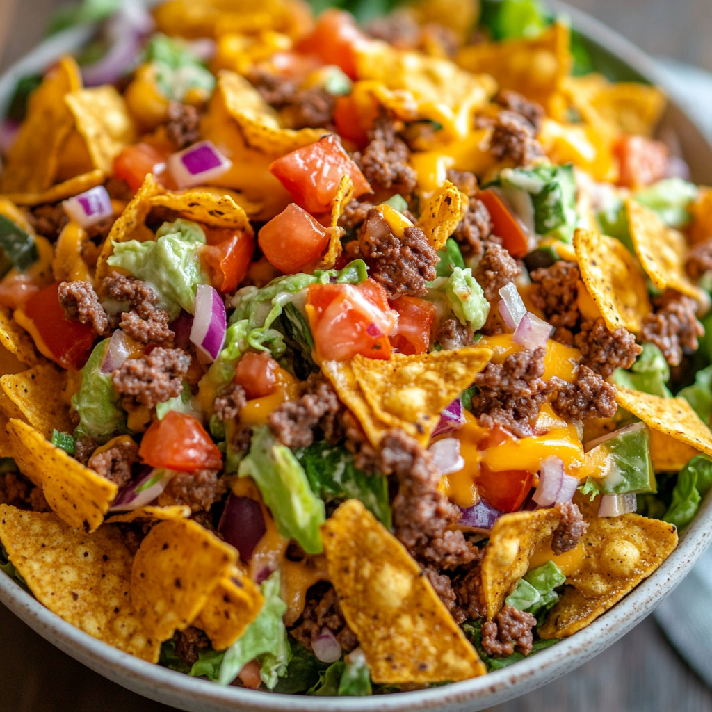 A crunchy, flavorful, and colorful salad loaded with seasoned ground beef, fresh vegetables, and cheesy Doritos, all tossed in a zesty dressing. Perfect for potlucks, family dinners, or game day!