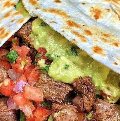 Step 6:I sliced the steak thinly against the grain. On top of the filled tortillas, I put the slices.