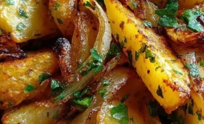 Roast in the preheated oven for 35–40 minutes, flipping halfway through, until potatoes are golden brown and crisp on the edges and onions are caramelized.