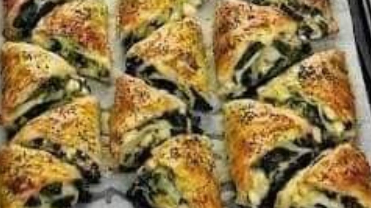 Mixing eggs, milk, oil, water also salt in a bowl. Laying out a sheet filo dough and pour a little of the mixture, spreading it over entire sheet. Repeat twice, for a total of 3 layer Mixing feta cheese and cook spinach and spreading over the filo dough. Rolling from one end to other to get a strip. Cutting to triangles also placing on a baking sheet. Brush every triangle with egg yolk. Sprinkling with poppy seeds and baking at 180°C (356°F) for 15 min